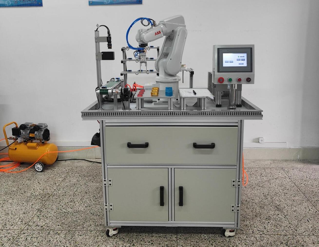 工業(yè)機(jī)器人綜合實(shí)訓(xùn)平臺(tái) 是專(zhuān)門(mén)針對(duì)工業(yè)機(jī)器人領(lǐng)域的一套實(shí)訓(xùn)實(shí)驗(yàn)教學(xué)系統(tǒng),按照模塊化結(jié)構(gòu)進(jìn)行設(shè)計(jì),主要由六關(guān)節(jié)工業(yè)機(jī)器人、視覺(jué)系統(tǒng)、 PLC 模塊、電氣控制系統(tǒng)等組成,可進(jìn)行工業(yè)機(jī)器人相關(guān)技術(shù)開(kāi)發(fā)、維護(hù)維修、示教等方面專(zhuān)項(xiàng)實(shí)訓(xùn)教學(xué),能夠完成關(guān)鍵設(shè)備的特性和參數(shù)設(shè)置、工業(yè)機(jī)器人手動(dòng)控制及基本參數(shù)設(shè)置、工業(yè)機(jī)器人 IO 通信及 PLC 信息交互、工業(yè)機(jī)器人單軸運(yùn)動(dòng)與線性運(yùn)動(dòng)控制、工業(yè)機(jī)器人工具 TCP 參數(shù)標(biāo)定、工業(yè)機(jī)器人工件坐標(biāo)系參數(shù)標(biāo)定及多坐標(biāo)系切換、基于關(guān)鍵點(diǎn)的軌跡編程、模擬碼垛工藝應(yīng)用編程、工業(yè)機(jī)器人與 PLC 的通訊與聯(lián)調(diào)、觸摸屏控制應(yīng)用等實(shí)訓(xùn)任務(wù)。