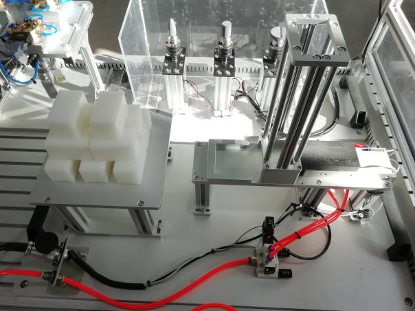 2 碼垛:碼垛是模擬工業(yè)場(chǎng)合的自動(dòng)搬運(yùn)碼垛功能設(shè)計(jì),可以自動(dòng)記錄碼垛位置和高度,具有重復(fù)精度高,自動(dòng)計(jì)算旋轉(zhuǎn)角度等功能;工業(yè)機(jī)器人工具盤(pán)上安裝了氣動(dòng)吸盤(pán);包含一個(gè)輸送帶,采用步進(jìn)電機(jī)驅(qū)動(dòng);電機(jī)速度可以進(jìn)行調(diào)節(jié);可以實(shí)現(xiàn)將模擬物料送到輸送帶上進(jìn)行定向傳送;具有傳感器能夠檢測(cè)模擬物料是否到達(dá)指定位置。