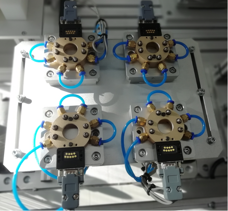 7 快換單元:由 4 種夾具組成,配合機(jī)器人使用作搬運(yùn)、涂膠、焊接、碼垛等用途。配置快換公頭 1 個(gè)、快換母頭 4 個(gè)、搬運(yùn)夾具 2 套、涂膠夾具 1 套、焊接工具 1 套、電磁閥 3 個(gè),并標(biāo)準(zhǔn)固定機(jī)構(gòu),移動(dòng)式底板。