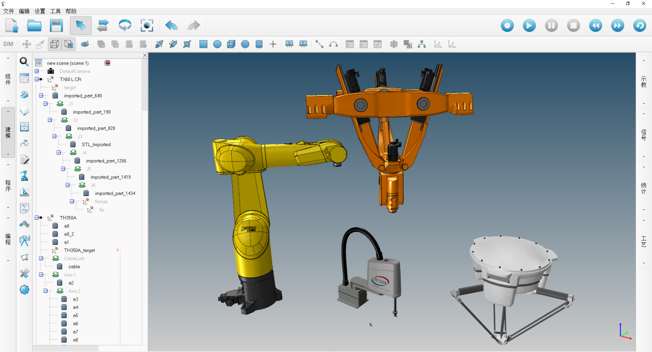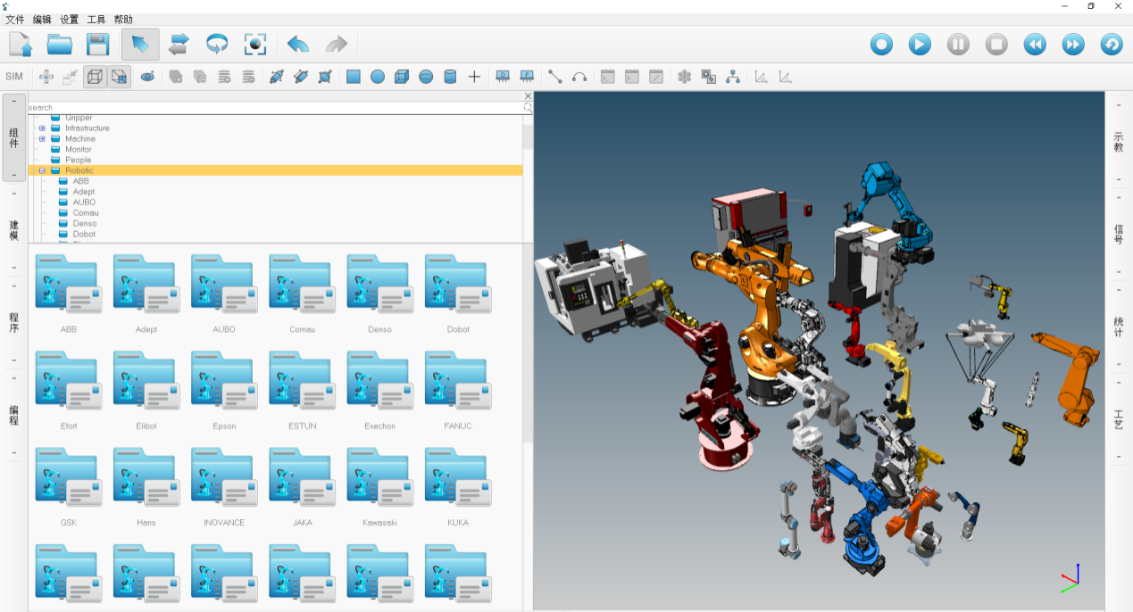 ( 1 )仿真系統支持 50 種以上的各品 牌機器人模型和大量生產線組件庫;