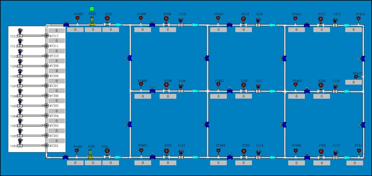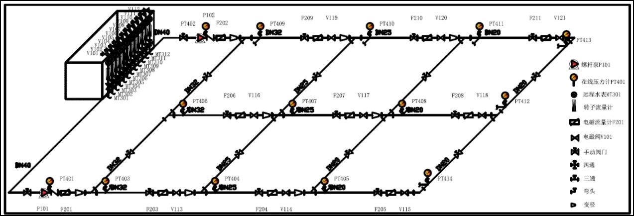 市政給水管網(wǎng)中的水流狀態(tài),是一個(gè)隨供水壓力和實(shí)際用水量變化而時(shí)時(shí)改變的復(fù)雜狀態(tài)。室外給水管網(wǎng)仿真實(shí)驗(yàn)通過(guò)對(duì)水泵工作頻率的改變來(lái)實(shí)現(xiàn)水泵工作揚(yáng)程的改變,從而模擬市政給水管網(wǎng)供水壓力的變化;通過(guò)調(diào)整用水節(jié)點(diǎn)閥門(mén)的開(kāi)啟來(lái)實(shí)現(xiàn)管網(wǎng)中用水量的變化,從而來(lái)觀察由于供水壓力、水量和節(jié)點(diǎn)出流的改變而引起的管網(wǎng)工作狀態(tài)的變化和觀察室外給水管道系統(tǒng)的管中流量、節(jié)點(diǎn)壓力變化、管道水頭損失等過(guò)程。