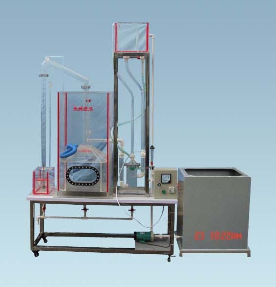 1 、 無閥濾池 1 套:透明有機玻璃材質、厚度 10mm ,含池體、進水槽、進水管、虹吸上升管、頂蓋、檔板、濾料層、承托層、配水系統(tǒng)、連通渠、沖洗水箱、出水管、虹吸輔助管、抽氣管、虹吸下降管、水封井、虹吸破壞斗、虹吸破壞管、有機玻璃池 1 只、反沖洗虹吸管 1 套、強制虹吸器 1 套、強制沖洗器 1 套、反沖洗出水井 1 只、反沖洗三角調節(jié)器 1 只、進水氣水分流器 1 只、進水高位水箱及自動反沖洗裝置 1 套、進水回氣管 1 根、過濾出水管 1 根;