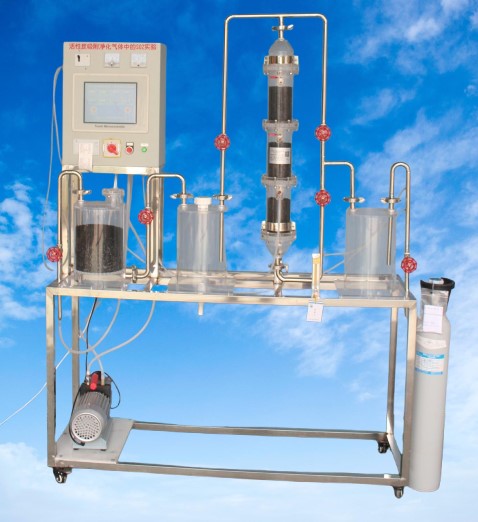 本實驗裝置采用有機(jī)玻璃吸附塔,以活性碳為吸附劑,通過模擬發(fā)生的有機(jī)物氣體或 S O 2 氣體進(jìn)行吸附試驗,得到吸附凈化效率、不同空塔氣速下穿透曲線和保護(hù)作用時間等數(shù)據(jù)。