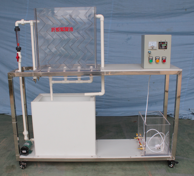 給水處理中澄清工藝通常包括混凝、沉淀和過濾,處理對象主要是水中懸浮物和膠體雜質(zhì)。原水加藥后,經(jīng)混凝使水中懸浮物和膠體形成大顆粒絮凝體,而后通過沉淀池進(jìn)行重力分離。折板絮凝池就是混凝、絮凝沉淀兩種功能的凈水構(gòu)筑物。本模型就是展示絮凝反應(yīng)池和折板絮凝池內(nèi)部構(gòu)造的實(shí)驗(yàn)裝置。