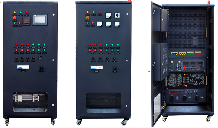 該種維修電工教學(xué)柜式實訓(xùn)考核裝置,包括有柜架、觀察窗、儀表操作盤、電氣系統(tǒng)、電機機組組成,所說的電氣系統(tǒng)由多個部分前后面板縱向展開排列,包括觸摸屏部分、 PLC 主機部分、變頻器部分、電力電子部分、直流電源部分、電力拖動與繼電控制部分,電機軸功率、力矩、轉(zhuǎn)速測量部分,交直流電壓、電流,單三相交流電能、交流功率、功率因數(shù)測量部分等組成。