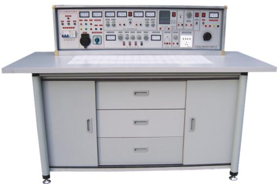 (一)實驗桌: 學生實驗桌 12 張,一桌二座,實驗桌外形尺寸為 160 × 70 × 80cm 。桌子中央配置通用九孔電路插板 ( 尺寸 :45 × 70cm) 。電路原理實驗部分根據電路在其上任意拼插元器件實驗盒成實驗電路。元件盒盒體透明直觀,內裝元件一目了然,盒蓋印有元件符號,線條清晰美觀。盒體與盒蓋采用較科學的壓卡式結構,維修、拆裝方便。實訓繼電控制部分元器件已裝在特制元件盒上,實驗時插在通用底板上就能連線實訓,方便、靈活。每張操作桌配有一粒膠皮板,保護通用電路板和桌面 ( 如需要在桌上放置電動機、焊接等 ) 桌子下部是元器件儲存柜,放置實驗元件器件及工具。