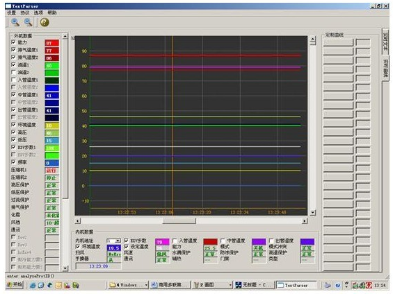 2)、軟件控制,能在線控制系統(tǒng)的溫度,讀取機組在最佳溫度系統(tǒng)制冷冷媒的流量開度數(shù),調(diào)整制冷機組的過熱度,過冷度。該文本顯示界面的左側(cè),以文本的形式實時顯示當前機組的運行數(shù)據(jù)。在界面右側(cè)的上半部分,是對通訊信息的顯示,包括通訊角色及通訊端口的設(shè)定值以及對當前通訊狀態(tài)的顯示。在界面右側(cè)的下半部分 " 數(shù)據(jù)信息 " 中,顯示當前接收到哪種數(shù)據(jù)幀、接收到的數(shù)據(jù)幀的地址、等信息。具有上位機調(diào)節(jié)的線上和手動調(diào)節(jié)功能: