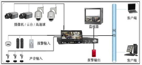 前端部分:前端完成模擬視頻的拍攝,探測器報警信號的產(chǎn)生,云臺、防護(hù)罩的控制,報警輸出等功能。主要包括:攝像頭、電動變焦鏡頭、室外紅外對射探測器、雙監(jiān)探測器、溫濕度傳感器、云臺、防護(hù)罩、解碼器、警示燈、警笛等設(shè)備(設(shè)備使用情況根據(jù)用戶的實際需求配置)。攝像頭通過內(nèi)置CCD及輔助電路將現(xiàn)場情況拍攝成為模擬視頻電信號,經(jīng)同軸電纜傳輸。電動變焦鏡頭將拍攝場景拉近、推遠(yuǎn),并實現(xiàn)光圈、調(diào)焦等光學(xué)調(diào)整。溫、濕度傳感器可探測環(huán)境內(nèi)溫度、濕度,從而保證內(nèi)部良好的物理環(huán)境。云臺、防護(hù)罩給攝像機(jī)和鏡頭提供了適宜的工作環(huán)境,并可實現(xiàn)拍攝角度的水平和垂直調(diào)整。解碼器是云臺、鏡頭控制的核心設(shè)備,通過它可實現(xiàn)使用微機(jī)接口經(jīng)過軟件控制鏡頭、云臺。