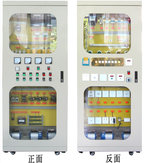 1、本裝置采用正反二面開門的離墻式威圖電氣控制柜,且正反面同時都可以操作,柜體中寬度能保證兩個學生同時合作接線實訓的需要,其外形尺寸寬×厚×高分別為: 800 × 600 × 2000 mm 。柜體采用厚度為 1.5 以上的優質鋼板,柜門采用厚度為國標 2.0 以上的優質鋼板并安裝四塊大的玻璃,學生能通過玻璃看清柜內各元器件及相應的動作,金屬表面噴塑,柜體中間有二塊優質環氧樹脂絕緣板和相應的支架系統隔離正反兩個柜體,安裝板上安裝智能建筑電氣控制線路各實訓考核模塊。各元器件所有的接線端都連接至相應的專用實訓接線端子上,每個接線端上都套有用電腦打印接線端名稱及編號的套管,并且更換方便。被控制電機安裝于電氣控制柜內。